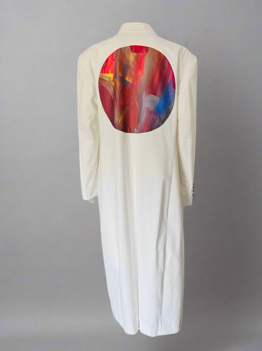 Beautiful oversized Arshys Pearl Coat in pure offwhite cotton. With a center back silk patch of digital rendering of the hand paintings of the artisans we support at Dubai Autism Center as our move towards diversity and inclusion.